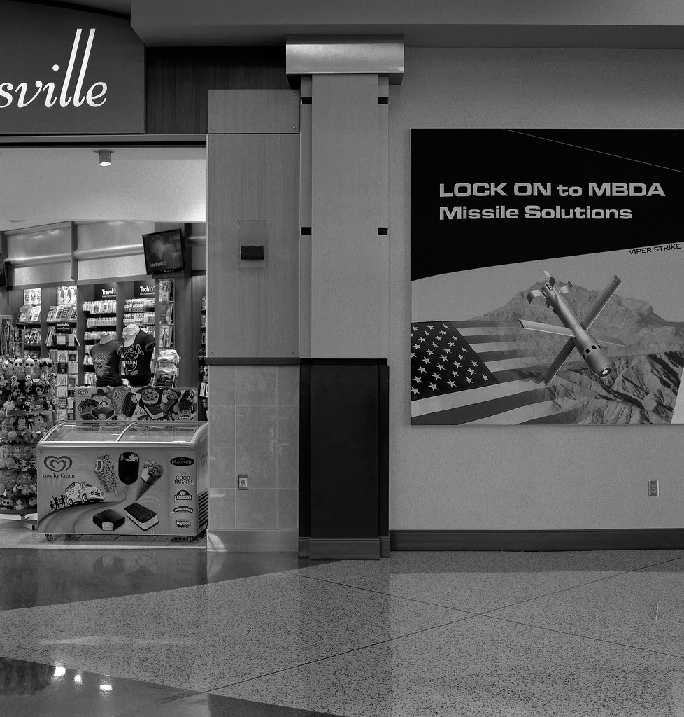 And the top shot by Austin Granger, a meditation upon America. A miracle of composition, dense with compressed information. The airport concessions rack, with those cute skull masks, Chinese in origin and made of that truly scary gooey-stretchy rubber that disintegrates into sugar candy, and yes, talking of artificial sweeteners, the Good Humor freezer (possibly also filled with skulls)... separated by that monolithic-looking black column (bearing a certain resemblance to The Slab in 2001) from the large advert for the firm that employs 30,000 folk in Huntsville, crafting the lethal weapons that will be sold for the ultimate profit of megatech munitions and aerospace firms from Old Europe... think Airbus.