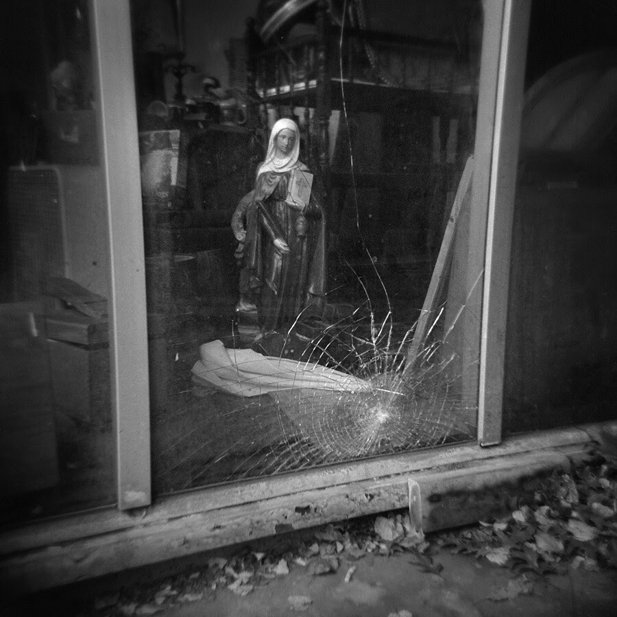 The ghostly Madonna in the thriftshop window looked down at us