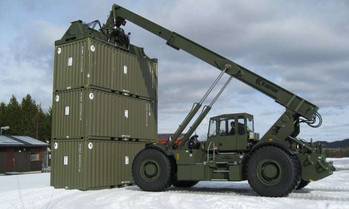Kalmar Rough Terrain Center has an alternative idea for that physical barrier: shipping containers.: photo by Steve Speakes / Kalmar via The Guardian, 29 March 2017