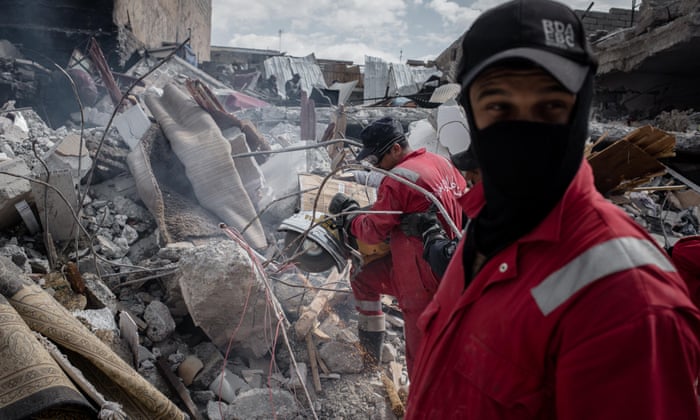 Members of an Iraqi rescue crew dig through the rubble of a house in western Mosul: photo by Cengiz Yar via The Guardian, 25 March 2017