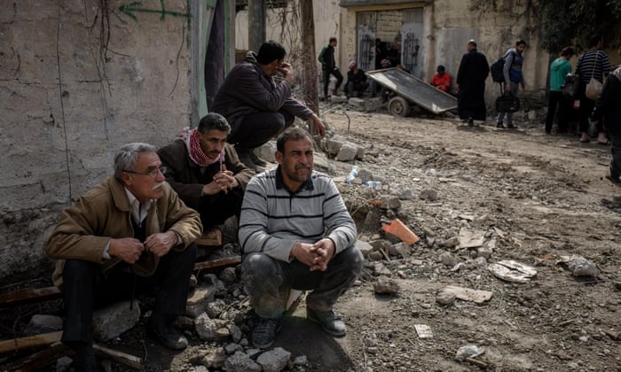 Men in the street as excavators dig through the rubble of a house in western Mosul: photo by Cengiz Yar via The Guardian, 25 March 2017