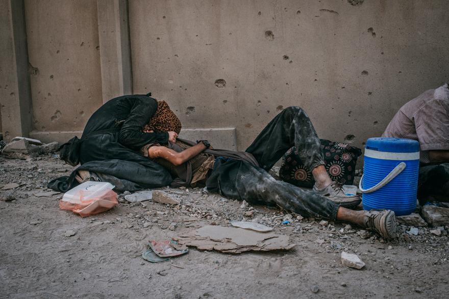 Erschöpft: Einem Luftangriff in der Altstadt von Mossul sind sie nur knapp entkommen: photo © Emanuele Satolli via ZEITONLINE, 15 July 2017