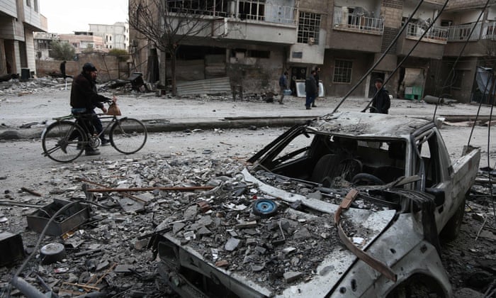 Syrian civilians look at the rubble following government bombing in the rebel-held town of Hamouria, in the besieged Eastern Ghouta region on the outskirts of the capital Damascus, on February 19, 2018.: photo by Abdulmonam Eassa/AFP, 19 February 2018