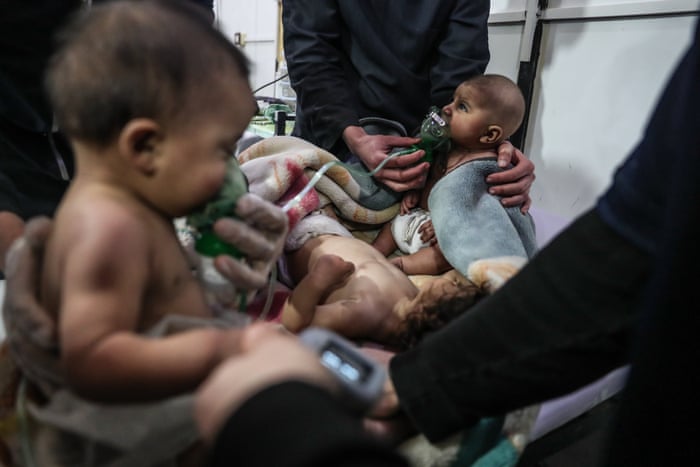 Children receive treatment after an alleged chlorine gas attack on Shifunieh, a village in eastern Ghouta. According to activists working in the area, one child died and more than 18 people were affected. Forces loyal to President Bashar al-Assad continue their air and ground attacks on the Damascus suburb: photo by Mohammed Badra/EPA, 26 February 2018