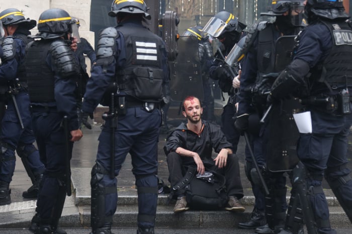 Paris, France. A wounded demonstrator is surrounded by riot police officers during a protest by French public sector employees: photo by Zakaria Abdelkafi/AFP, 22 May 2018