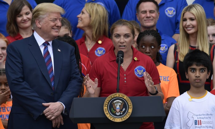Trump listens as beach volleyball star Misty May-Treanor speaks at the White House Sports and Fitness Day event.: photo by Susan Walsh/AP, 20 May 2018
