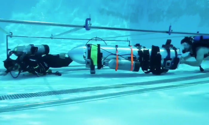 A submarine made by Elon Musk’s SpaceX and The Boring Company designed to help the rescue is tested in a swimming pool.: photo via Reuters, 10 July 2018