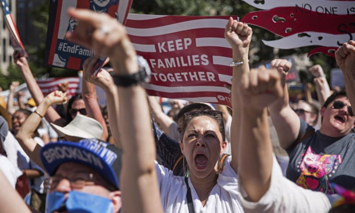 Activists shout during a rally to protest the Trump administration’s immigration policies in New York.: photo by Kevin Hagen/AP, 30 June 2018