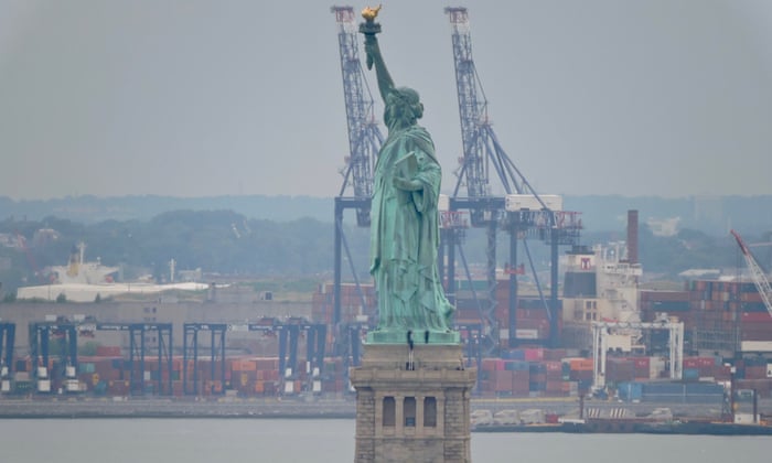Park police negotiate with a protester who climbed the pedestal of the the Statue of Liberty in New York on Wednesday.: photo by Harry Slater for the Guardian, 4 July 2018