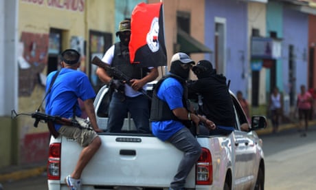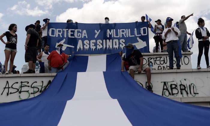 Anti-government demonstrators in Managua hold a banner reading ‘Ortega and Murillo assassins’, referring to the Nicaraguan president, Daniel Ortega, and the vice-president, his wife Rosario Murillo.: photo Marvin Recinos/AFP/Getty Images, 30 July 2018