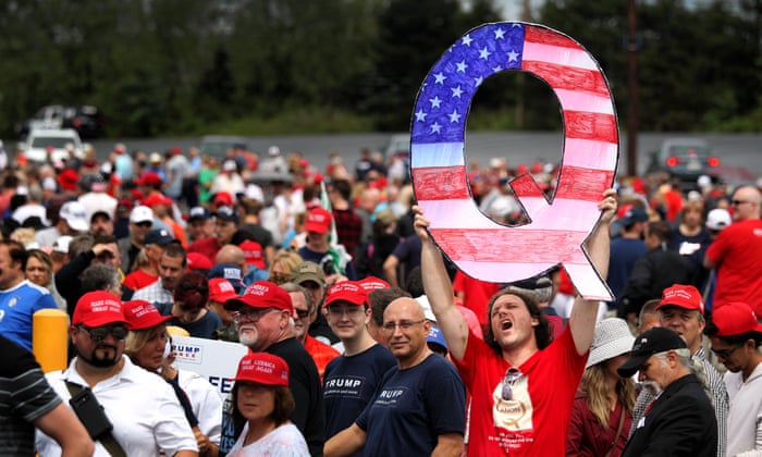 A man holds up a large ‘Q’ sign while waiting in line for a Trump rally in Wilkes-Barre, Pennsylvania.: photo Rick Loomis/Getty Images, 2 August 2018