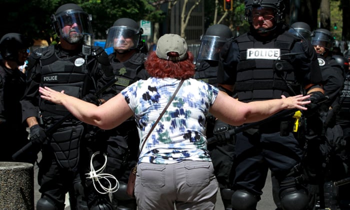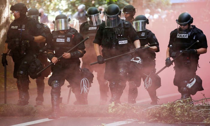 Portland police confront anti-fascists during a rally in Portland, Oregon on Saturday.: photo by Terray Sylvester for the Guardian, 4 August 2018