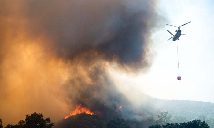 A helicopter drops water on a fire in Lake county north of San Francisco.: photo by Mark McKenna/ZUMA Wire/REX/Shutterstock, 4 August 2018