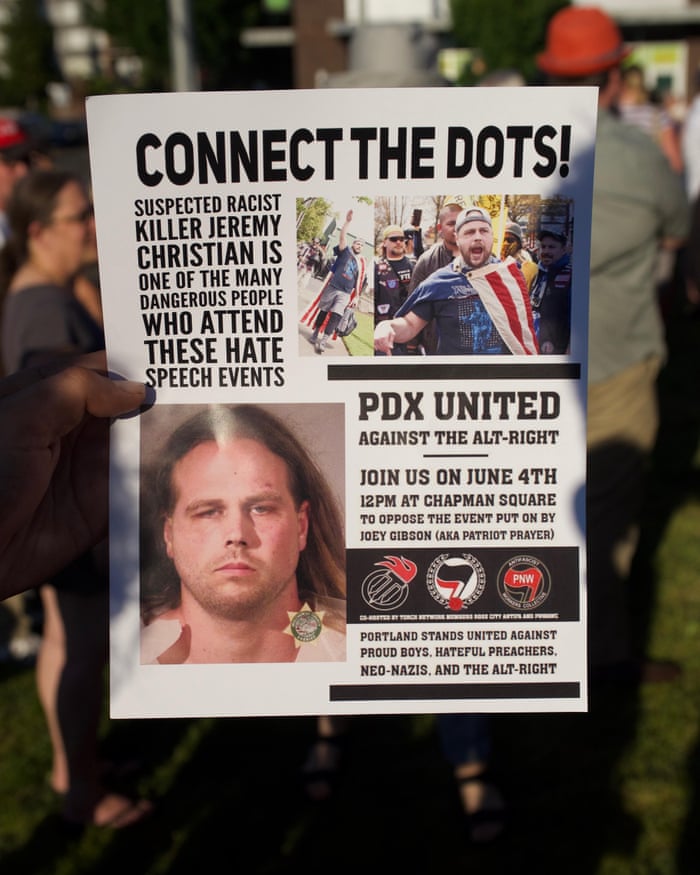 “Jeremy Christian has nothing to do with us”, Gibson told the Guardian. “He’s not even a Trump supporter. He showed up at our march out of nowhere. None of us knew who he was. None of us had ever seen him. Folks from antifa and liberals in Portland have used pictures of him at the rally, trying to paint the picture that we’re all white supremacists.”