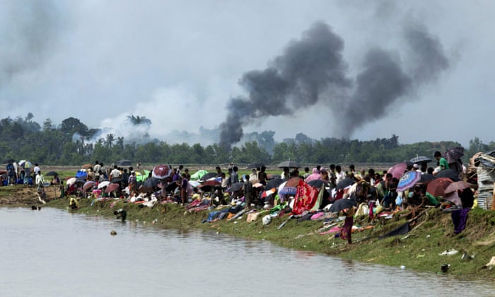 Smoke billows above what is believed to be a burning village in Rakhine state as members of the Rohingya Muslim minority take shelter in a no-man’s land between Bangladesh and Myanmar.: photo by K.m. Asad/AFP/Getty via The Guardian, 7 September 2017