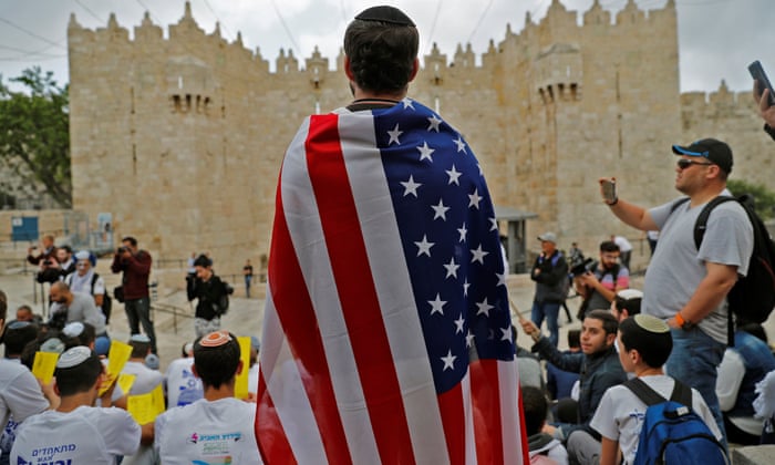An Israeli man draped in the stars and stripes at Damascus gate in Jerusalem on Sunday.: photo by Ahmad Gharabli/AFP/Getty Image, 13 May 2018