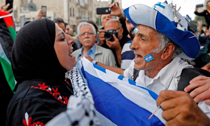 An Israeli man confronts a Palestinian woman at Damascus gate in Jerusalem on Sunday as Israeli settlers celebrate Jerusalem Day in the Old City.: photo by Menahem Kahana/AFP/Getty Images, 13 May 2018